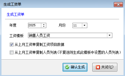 生成工資單:點擊“生成工資單”按鈕,可以彈出生成工資單窗口,在此窗口可以選擇年度、月份及相應(yīng)的工資模板,然后點擊“確認(rèn)生成”按鈕即可生成相應(yīng)的工資單,另外也可以打勾選擇“從上月工資單復(fù)制工資項目數(shù)據(jù)”及“從上月工資單復(fù)制人員列表(不復(fù)選則生成工資發(fā)放模板中設(shè)置的相應(yīng)人員的工資)”選項,打勾復(fù)選,本月的工資項目數(shù)據(jù)則可以復(fù)制上月的工資項目數(shù)據(jù),不復(fù)選則不會復(fù)制上月的工資項目數(shù)據(jù),如圖所示。