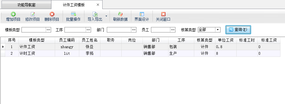 查詢:可以根據(jù)模板類型、工序、部門、員工、核算類型等條件進(jìn)行查詢計件工資模板。