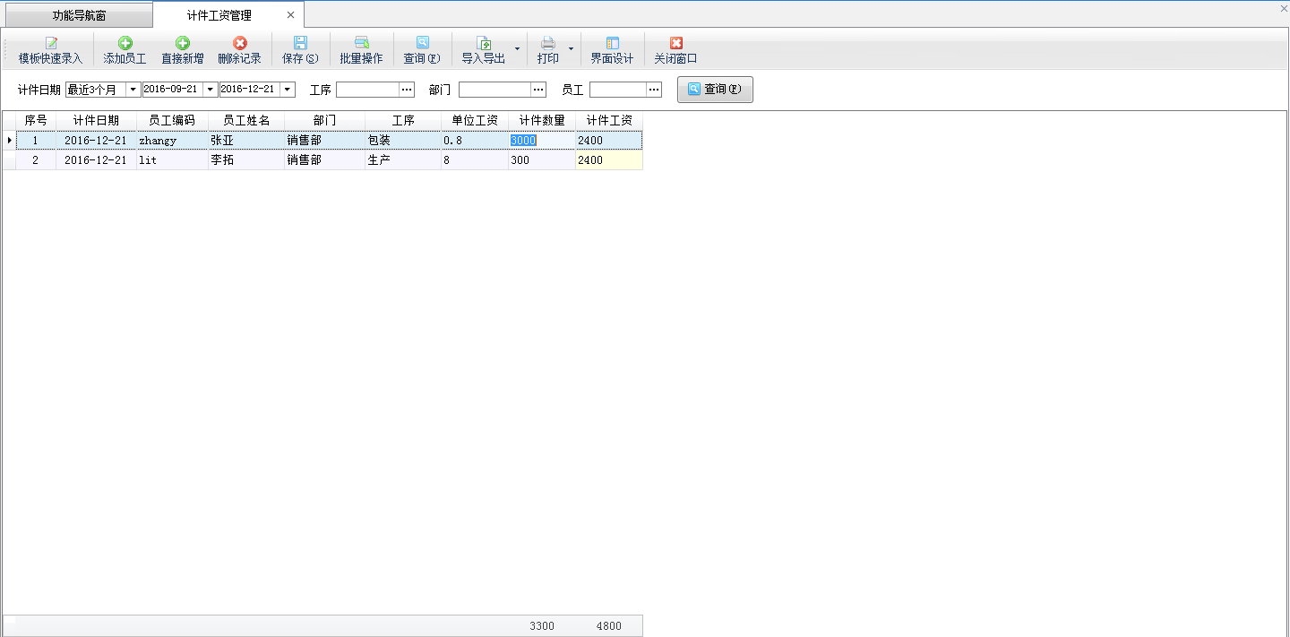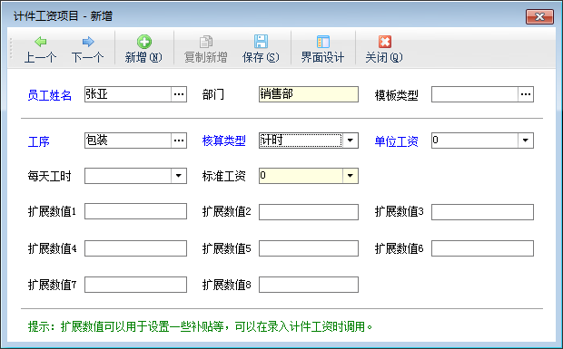 直接新增:點擊工具欄的“直接新增”按鈕,直接會在計件工資管理界面添加一條空白的計件工資信息。