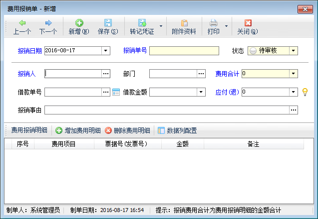 ????點擊“新增”按鈕可以在當(dāng)前信息保存后不關(guān)閉窗口直接錄入下一個新的報銷單。