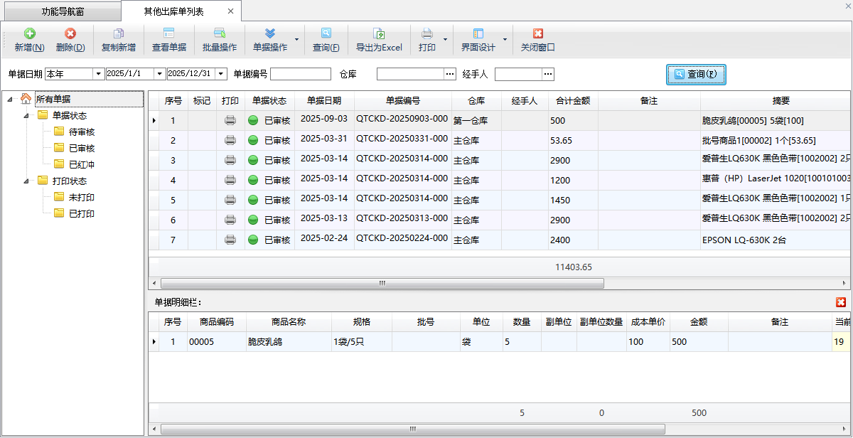 ????在功能導航窗點“倉庫管理”—》“其他出庫單”即可進入“其他出庫單列表”界面,如下圖所示: