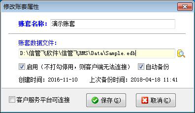 修改:修改賬套屬性時(shí),如果有客戶端已登錄這個(gè)賬套,則需要先退出客戶端程序,然后再進(jìn)行賬套屬性的修改。修改賬套屬性時(shí),可以不啟用賬套(即停用),停用后的賬套客戶端程序無法連接;設(shè)置是否自動(dòng)備份賬套,如果設(shè)置自動(dòng)備份,并且系統(tǒng)參數(shù)設(shè)置中也啟用了賬套備份,則軟件會(huì)按照賬套備份參數(shù)中的時(shí)間間隔定期備份此賬套。