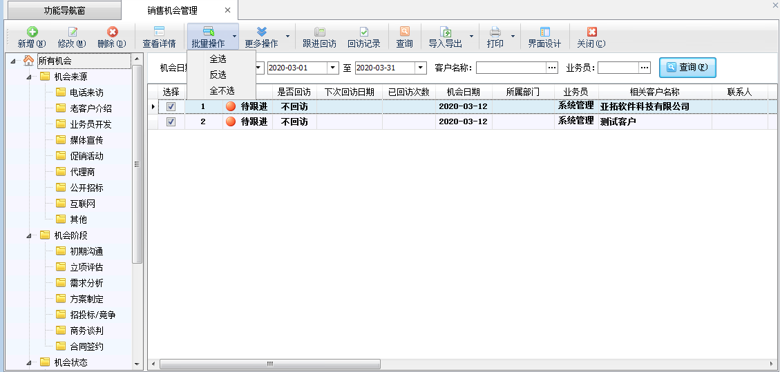 ????在功能導航窗點擊“客戶關系”—》“銷售機會”打開銷售機會管理界面,選擇工具欄的“批量操作”按鈕,進入批量操作模式,選擇需要批量設置的銷售機會(批量操作支持全選、全不選、反選),如下圖所示: