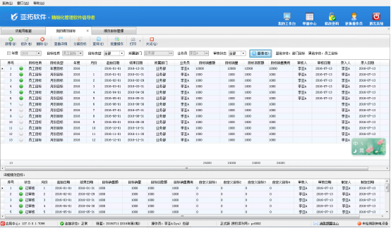 ????查詢:可以根據(jù)年度、目標(biāo)性質(zhì)、目標(biāo)類型、部門、業(yè)務(wù)員及審核狀態(tài)等條件查詢績(jī)效目標(biāo)記錄。