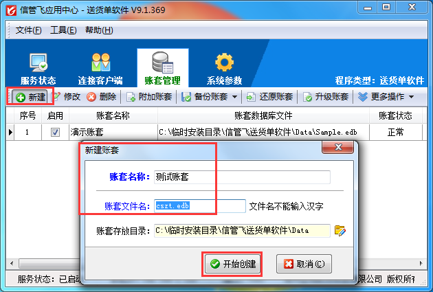 ????賬套即賬套數據庫,這是一個會計業務引申出來的概念,賬套數據庫中存儲業務數據。使用軟件之前建議新增加一個賬套,用于重新錄入和管理數據,信管飛RMS、信管飛倉庫管理軟件、信管飛送貨單軟件、信管飛出納記賬軟件、信管飛票據打印軟件等軟件的賬套都是在主機電腦的應用中心程序上集中管理的,下面我們以信管飛送貨單軟件為例詳細介紹下在使用軟件之前如何新增加一個賬套?