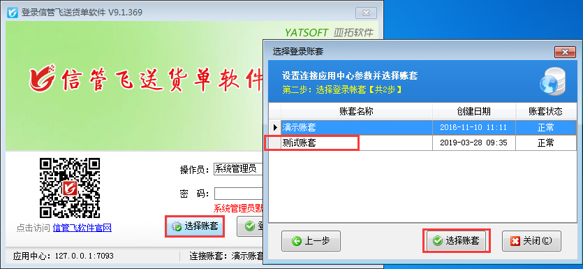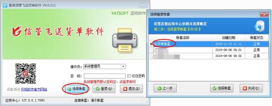 ????運行信管飛送貨單軟件客戶端(藍色圖標),在軟件登錄界面點擊“選擇賬套”,在“選擇登錄賬套”界面選擇我們所需要的賬套,然后登錄軟件即可。