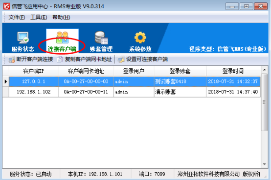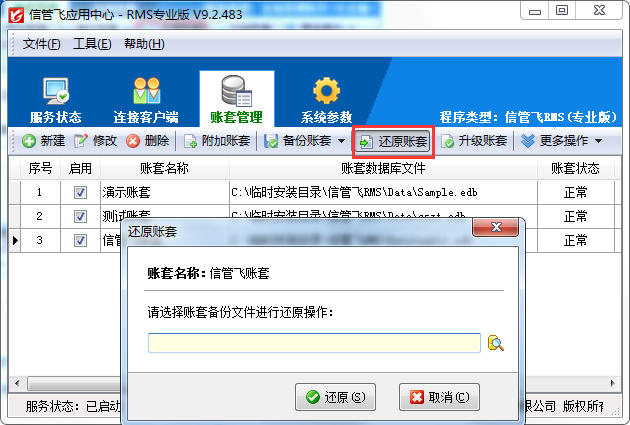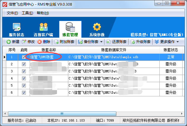 ????打開信管飛RMS應用中心(桌面右下角紅色的圖標)—》“賬套管理”即可進入賬套管理界面,如下圖所示: