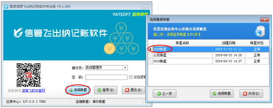 ????運行信管飛出納記賬軟件客戶端(藍色圖標),在軟件登錄界面點擊“選擇賬套”,在“選擇登錄賬套”界面選擇我們所需要的賬套,然后登錄軟件即可。