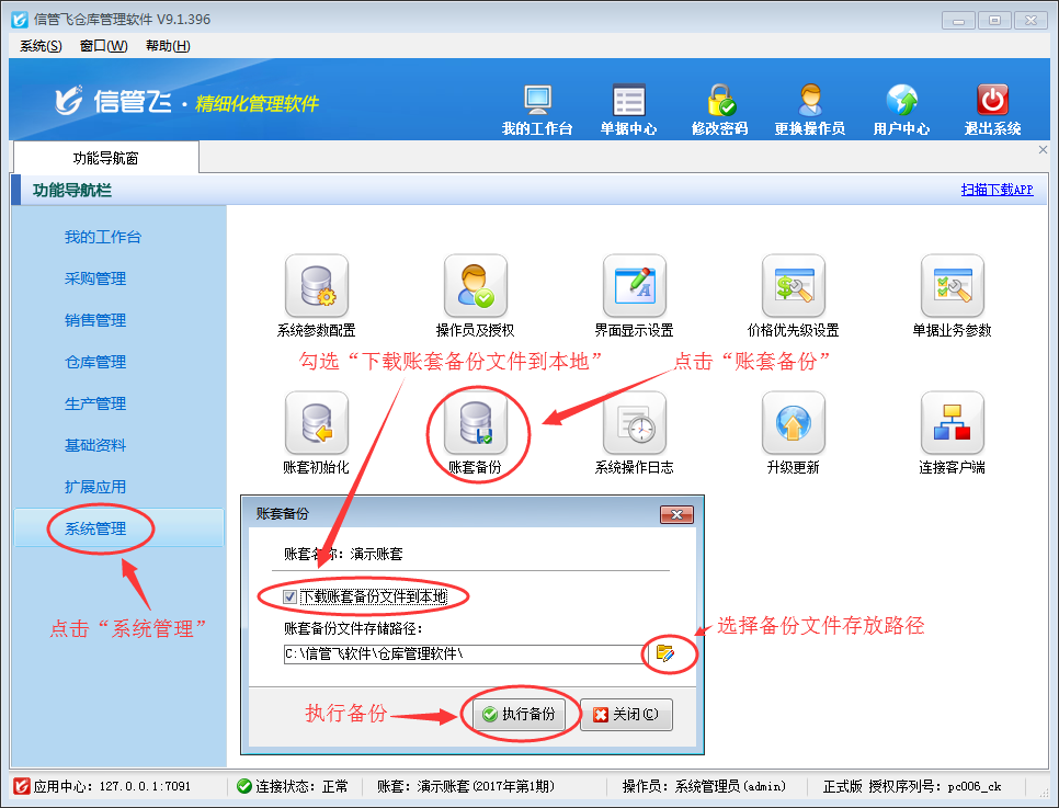 ????請用系統管理員賬號登錄信管飛倉庫管理軟件客戶端,然后在功能導航窗中點擊“系統管理”—》“賬套備份”同樣可以執行賬套備份操作,如下圖所示。