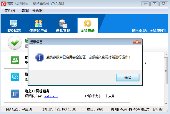 ????動態IP解析服務是亞拓軟件開發的基于互聯網的遠程連接解決方案,采用專屬安全技術,可以支持網絡版本在異地連接主機電腦進行共享數據使用。動態IP解析服務屬于增值服務,使用需要另外進行購買,購買后會分配解析賬號、管理密碼和使用口令信息,管理密碼和使用口令可以自己修改。下面我們以信管飛RMS為例介紹一下如何修改動態IP解析服務的管理密碼及使用口令。