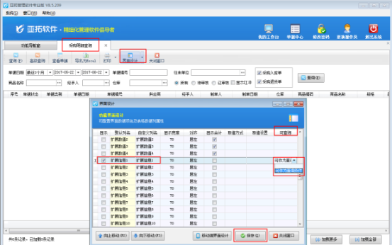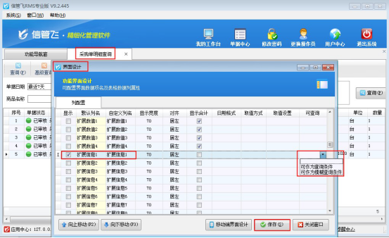 ????以“采購(gòu)單明細(xì)查詢”為例,示范下如何在界面設(shè)計(jì)中配置。功能導(dǎo)航窗選擇“采購(gòu)管理”在右側(cè)的查詢統(tǒng)計(jì)下打開(kāi)“采購(gòu)單明細(xì)查詢”進(jìn)入采購(gòu)單明細(xì)查詢界面,點(diǎn)擊“界面設(shè)計(jì)”按鈕,在打開(kāi)的界面設(shè)計(jì)窗口中找到“擴(kuò)展信息1”數(shù)據(jù)項(xiàng),勾選顯示并在可查詢處設(shè)置“可作為查詢條件”,然后保存設(shè)置,如下圖所示: