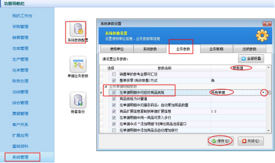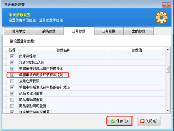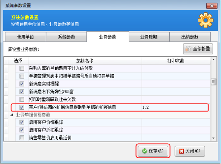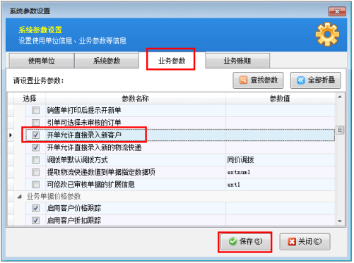 ????軟件中默認(rèn)是允許開(kāi)單時(shí)直接錄入新客戶/供應(yīng)商的。如果該業(yè)務(wù)參數(shù)沒(méi)有被勾選,需要我們?cè)谑褂么斯δ苤皩?duì)相應(yīng)的業(yè)務(wù)參數(shù)進(jìn)行設(shè)置。在“業(yè)務(wù)參數(shù)”界面上我們將“開(kāi)單允許直接錄入新客戶”勾選上,然后進(jìn)行保存。