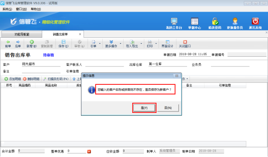 ????此時(shí)我們即可到銷售或采購(gòu)業(yè)務(wù)單據(jù)開(kāi)單界面上進(jìn)行直接錄入新客戶/供應(yīng)商的操作,我們以開(kāi)銷售出庫(kù)單為例來(lái)演示一下具體操作流程。在銷售出庫(kù)單上面輸入新客戶的名稱,然后鼠標(biāo)點(diǎn)一下其他任意一個(gè)輸入框,軟件中會(huì)提示“您輸入的客戶名稱或拼音碼不存在,是否保存為新客戶?”這時(shí)我們點(diǎn)擊“是”即可,填寫(xiě)銷售出庫(kù)單的其他信息后保存單據(jù),具體的操作界面如圖2所示。然后在“基礎(chǔ)資料”—》“客戶信息”里面可以查看到剛才新增的客戶信息。