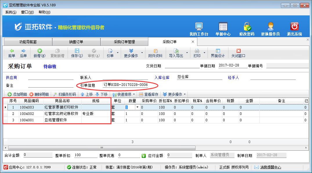 ????亞拓管理軟件和紅管家倉(cāng)庫(kù)管理軟件新增采購(gòu)單/銷售單后都可以直接保存并審核單據(jù),軟件還支持批量審核采購(gòu)單/銷售單,如果您每天錄單數(shù)量較多,為了節(jié)省寶貴時(shí)間提高工作效率,您可以使用批量審核采購(gòu)單/銷售單功能。下面我們介紹一下在亞拓管理軟件專業(yè)版中批量審核采購(gòu)單的具體的操作步驟。