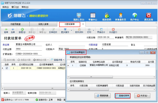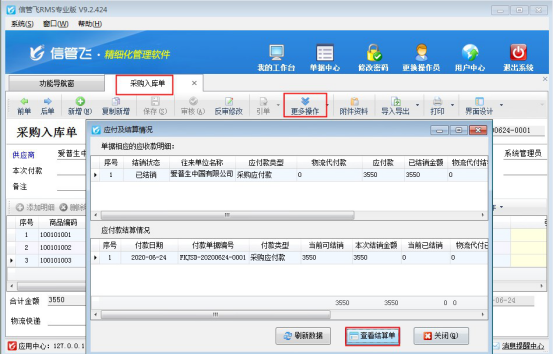 ????本篇文章以信管飛RMS為例,示范下如何修改應(yīng)付款已結(jié)銷的采購(gòu)入庫(kù)單單據(jù),打開(kāi)應(yīng)付款已結(jié)銷的采購(gòu)入庫(kù)單單據(jù),在更多操作下點(diǎn)擊“查看應(yīng)付款及結(jié)銷情況”,彈出應(yīng)付款及結(jié)銷情況界面,點(diǎn)擊“查看結(jié)算單”可以打開(kāi)本單據(jù)的應(yīng)付款結(jié)算單界面,如下圖所示: