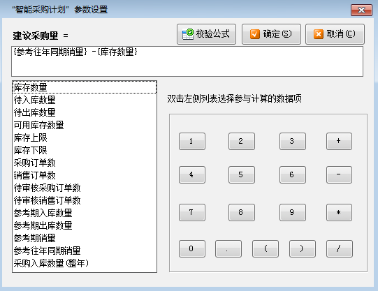 ????(1)參數(shù)設(shè)置:可以設(shè)置“建議采購(gòu)量”的運(yùn)算公式,軟件將根據(jù)您設(shè)計(jì)的公式計(jì)算出建議數(shù)量。
