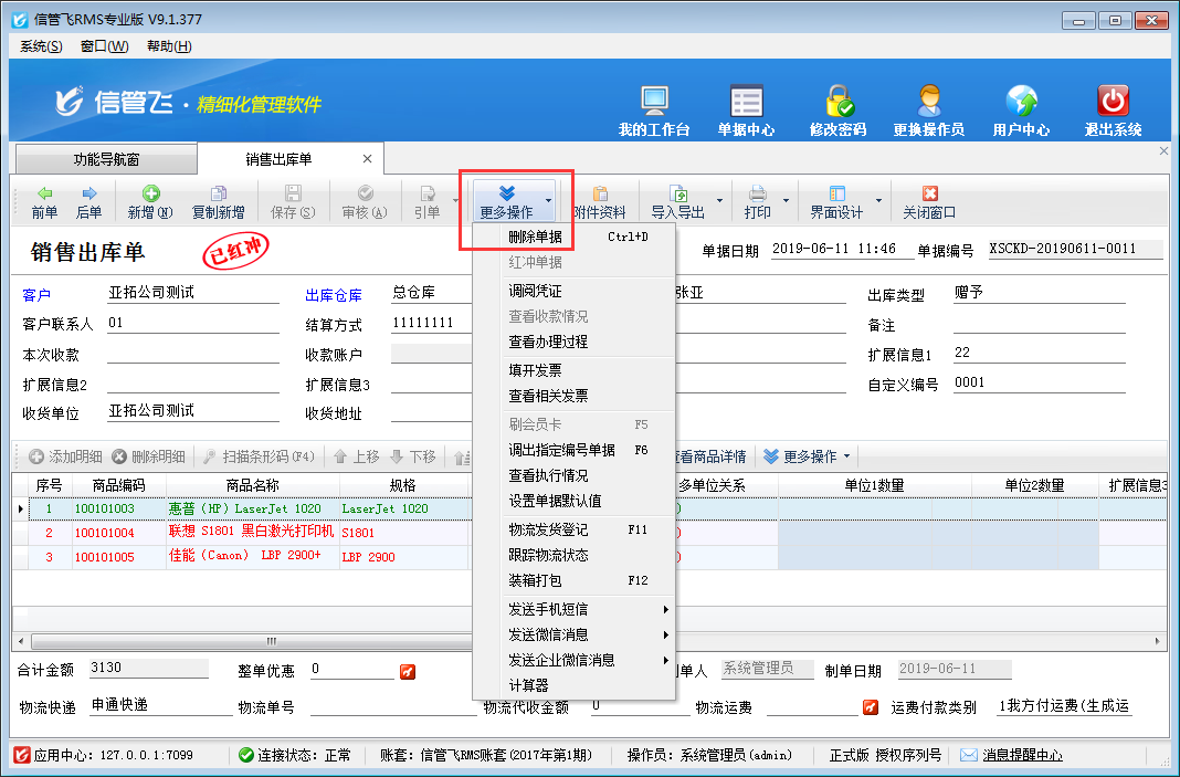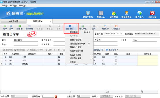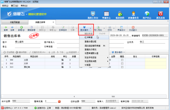 ????打開(kāi)客戶名稱有誤的銷售出庫(kù)單,點(diǎn)擊“更多操作”—》“紅沖單據(jù)”,來(lái)將“已審核”的單據(jù)進(jìn)行紅沖,紅沖后的單據(jù)會(huì)變?yōu)闊o(wú)效,紅沖相當(dāng)于作廢,相應(yīng)的應(yīng)收款會(huì)刪除,之前對(duì)庫(kù)存的影響也會(huì)解除。如下圖所示: