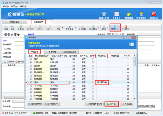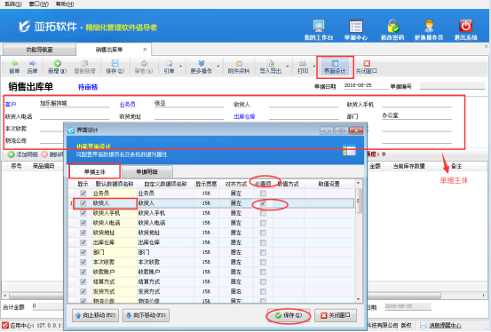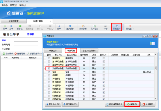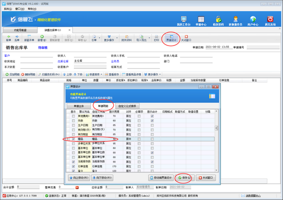 ????首先打開(kāi)銷售出庫(kù)單開(kāi)單界面,如下圖所示,軟件默認(rèn)不顯示“贈(zèng)品”項(xiàng),需要先通過(guò)界面設(shè)計(jì)配置將“贈(zèng)品”項(xiàng)勾選顯示出來(lái)。在工具欄點(diǎn)擊“界面設(shè)計(jì)”—》“單據(jù)明細(xì)”,找到“贈(zèng)品”項(xiàng),將其勾選顯示出來(lái),然后點(diǎn)擊“保存”按鈕保存設(shè)置。