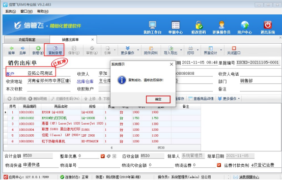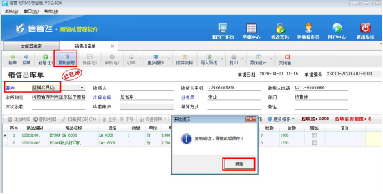 ????單據(jù)紅沖后,點(diǎn)擊工具欄中的“復(fù)制新增”按鈕,系統(tǒng)彈出提示框“復(fù)制成功,請(qǐng)修改后保存!”,點(diǎn)擊“確定”按鈕,如下圖所示:
