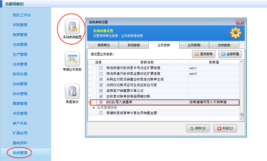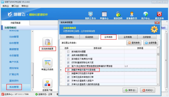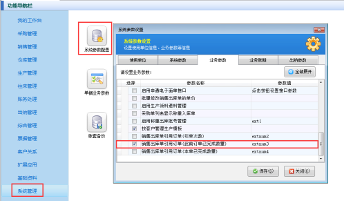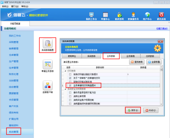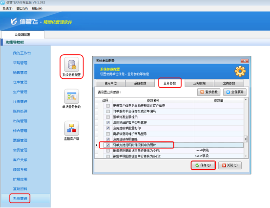 ????在功能導(dǎo)航窗點(diǎn)擊“系統(tǒng)管理”—》“系統(tǒng)參數(shù)配置”—》“業(yè)務(wù)參數(shù)”,即可進(jìn)入到“業(yè)務(wù)參數(shù)”配置界面。在業(yè)務(wù)單據(jù)相關(guān)參數(shù)內(nèi)找到并勾選“銷售單打印后提示開(kāi)新單”參數(shù)。如下圖所示: