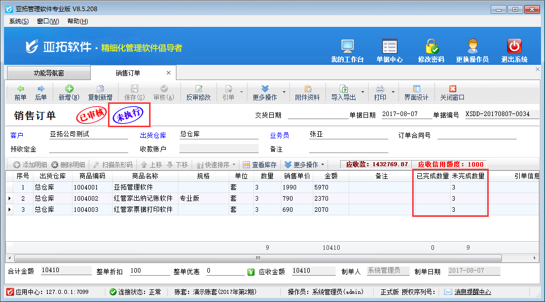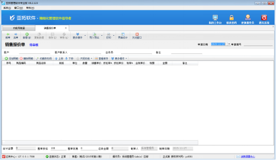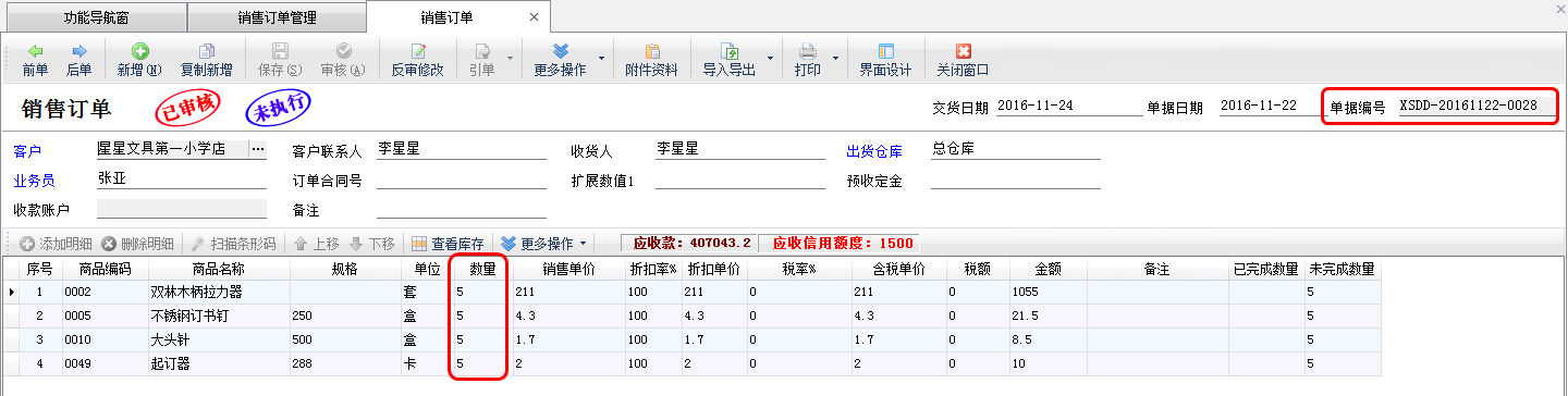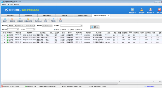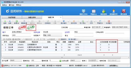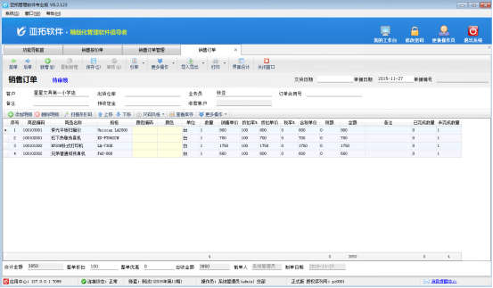 ????亞拓管理軟件星光版、標(biāo)準(zhǔn)版、專業(yè)版都支持在開(kāi)采購(gòu)訂單時(shí)直接引用銷售訂單明細(xì)數(shù)據(jù),以專業(yè)版軟件為例,開(kāi)采購(gòu)訂單時(shí)如何直接引用銷售訂單明細(xì)數(shù)據(jù)?首先我們先開(kāi)一個(gè)銷售訂單,保存并審核,如下圖所示: