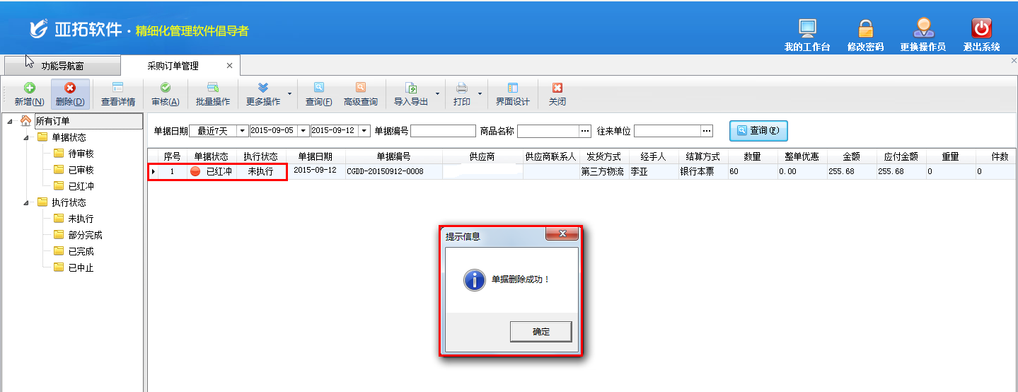 ????單據(jù)紅沖后即可進(jìn)行刪除操作,如下圖所示: