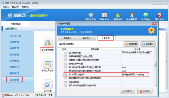 ????信管飛RMS(專業(yè)版、標(biāo)準(zhǔn)版、星光版)、信管飛倉(cāng)庫(kù)管理軟件都支持在采購(gòu)業(yè)務(wù)單據(jù)開(kāi)單時(shí)直接錄入新供應(yīng)商、在銷售業(yè)務(wù)單據(jù)開(kāi)單時(shí)直接錄入新客戶。軟件是否允許在開(kāi)單時(shí)直接錄入新客戶、供應(yīng)商,可以對(duì)相應(yīng)的業(yè)務(wù)參數(shù)進(jìn)行設(shè)置,下面我們以信管飛倉(cāng)庫(kù)管理軟件為例演示一下具體的操作步驟。