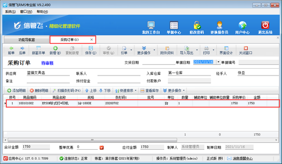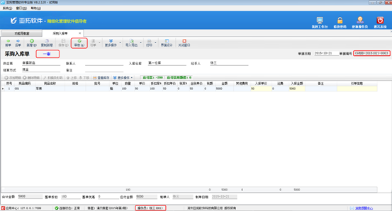 ????此時(shí)可以對(duì)采購(gòu)訂單其他信息錄入,保存審核即可。另外可以新增采購(gòu)入庫(kù)單引單采購(gòu)訂單,進(jìn)行采購(gòu)商品入庫(kù)。