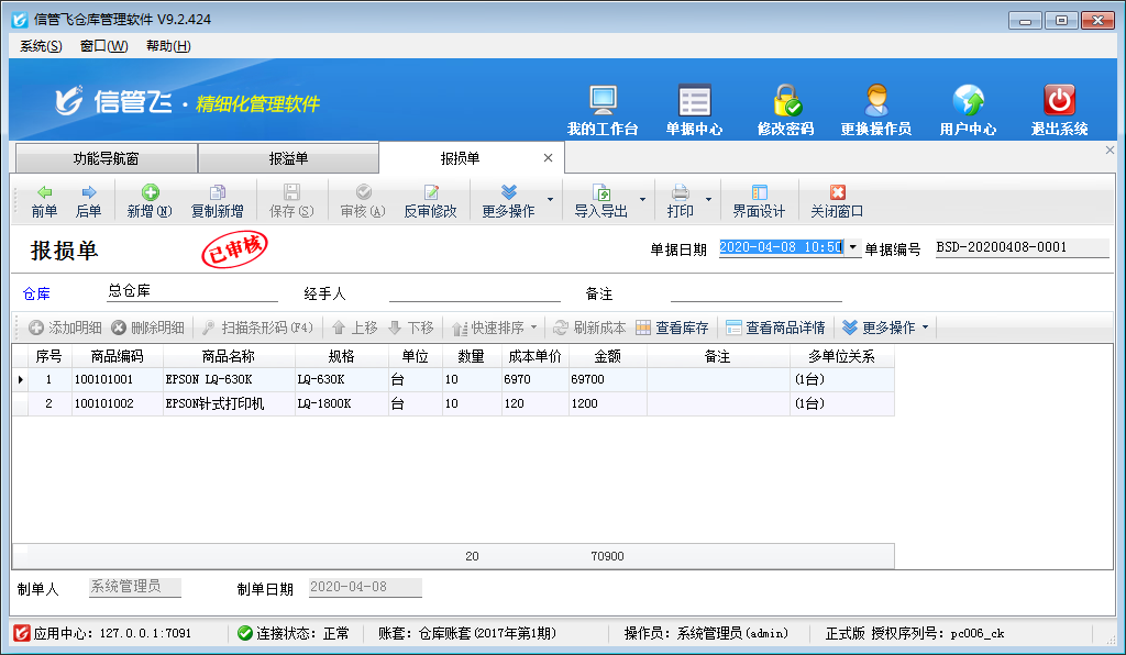 ????2、報(bào)損單:如果軟件中庫(kù)存數(shù)量大于實(shí)際的倉(cāng)庫(kù)中的庫(kù)存數(shù)量,這時(shí)我們可以開(kāi)報(bào)損單進(jìn)行調(diào)整庫(kù)存數(shù)量。 在功能導(dǎo)航窗點(diǎn)“倉(cāng)庫(kù)管理”—》“報(bào)損單”,報(bào)損單保存審核后,單據(jù)明細(xì)中相應(yīng)商品的庫(kù)存數(shù)量會(huì)減少,操作界面如下圖2所示。
