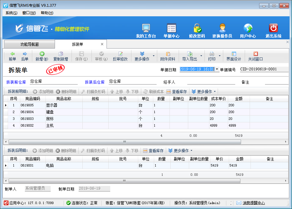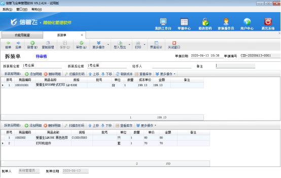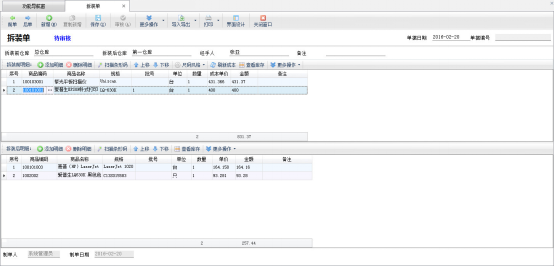 ????單據(jù)上方為“拆裝前商品明細(xì)”,單據(jù)保存并審核之后其相應(yīng)的商品將會(huì)出庫(kù)(即庫(kù)存數(shù)量會(huì)減少),單據(jù)下方為“拆裝后商品明細(xì)”,單據(jù)保存并審核之后其相應(yīng)的商品將會(huì)入庫(kù)(即庫(kù)存數(shù)量會(huì)增加)。