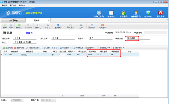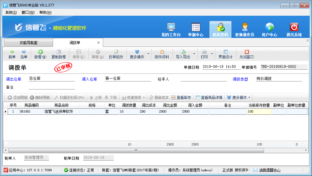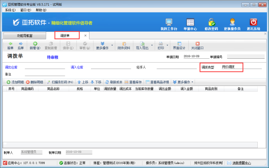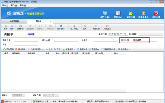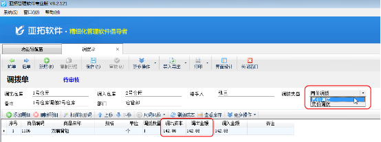 ????設(shè)置好系統(tǒng)參數(shù),打開(kāi)“倉(cāng)庫(kù)管理”的調(diào)撥單界面,會(huì)看到調(diào)撥方式自動(dòng)顯示“同價(jià)調(diào)撥”,不需要再手動(dòng)進(jìn)行選擇。