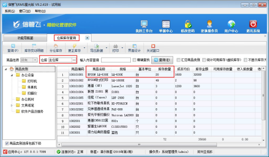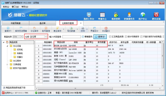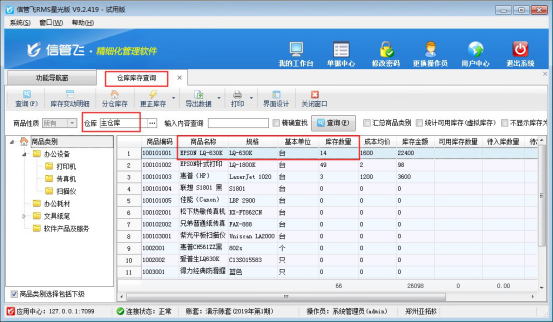 ????本文以“信管飛倉(cāng)庫(kù)管理軟件”為例,示范下如何開(kāi)“盤點(diǎn)單”,在功能導(dǎo)航窗點(diǎn)擊“倉(cāng)庫(kù)管理”—>“倉(cāng)庫(kù)庫(kù)存查詢”,可查看商品的當(dāng)前庫(kù)存數(shù)量,以示例商品“EPSON LQ-630K”的庫(kù)存數(shù)量為例,當(dāng)前查詢到庫(kù)存數(shù)數(shù)量為1。存在多倉(cāng)庫(kù)情況的,需要先選擇倉(cāng)庫(kù)然后再進(jìn)行查詢,是獲取查詢的倉(cāng)庫(kù)中的庫(kù)存數(shù)量,如下圖所示: