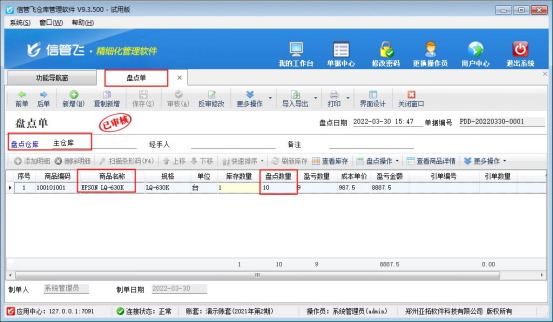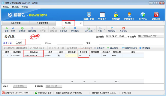 ????假如實(shí)際盤點(diǎn)商品“EPSON LQ-630K”庫(kù)存數(shù)量為10臺(tái),和軟件中查詢到的庫(kù)存數(shù)量不一致,需要在軟件中開(kāi)一個(gè)盤點(diǎn)單進(jìn)行更正庫(kù)存數(shù)量,在“倉(cāng)庫(kù)管理”中打開(kāi)“盤點(diǎn)單”,選擇倉(cāng)庫(kù)“主倉(cāng)庫(kù)”,然后選擇商品“EPSON LQ-630K”,輸入盤點(diǎn)數(shù)量“10”,然后保存審核盤點(diǎn)單,然后再次查詢庫(kù)存,可看到庫(kù)存數(shù)量已更正為10。如下圖所示: