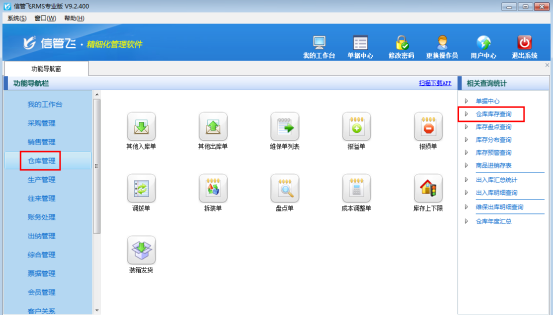 ????查詢批號(hào)商品不同批次庫(kù)存數(shù)量:在功能導(dǎo)航窗點(diǎn)“倉(cāng)庫(kù)管理”—》“相關(guān)查詢統(tǒng)計(jì)”—》“倉(cāng)庫(kù)庫(kù)存查詢”,即可進(jìn)入倉(cāng)庫(kù)庫(kù)存查詢界面,如下圖所示。