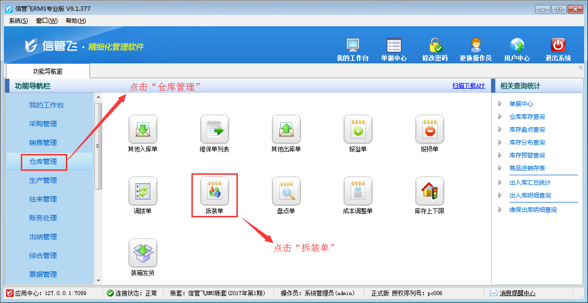 ????信管飛RMS及信管飛倉(cāng)庫(kù)管理軟件都支持拆裝單,拆裝單用于處理進(jìn)貨時(shí)為組件、配件、原料等,但銷售時(shí)卻是成套銷售的,比如電腦經(jīng)銷商,采購(gòu)的是電腦配件,但實(shí)際銷售的是整機(jī)。也有購(gòu)入的是整機(jī),但銷售的時(shí)候是按單個(gè)配件進(jìn)行銷售的情況,也可以使用拆裝單進(jìn)行處理。