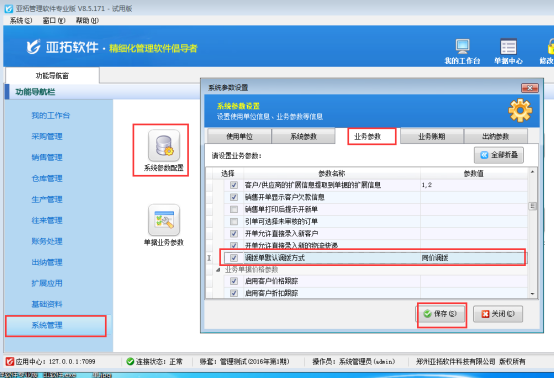 ????以亞拓管理軟件為例,首先設(shè)置參數(shù),在導(dǎo)航窗“系統(tǒng)管理”->系統(tǒng)參數(shù)配置->選擇“業(yè)務(wù)參數(shù)”的“調(diào)撥單默認(rèn)調(diào)撥方式”,后邊的參數(shù)值可選擇同價(jià)調(diào)撥或者變價(jià)調(diào)撥(示例選擇同價(jià)調(diào)撥)。勾選上此參數(shù)保存即可。具體如下圖: