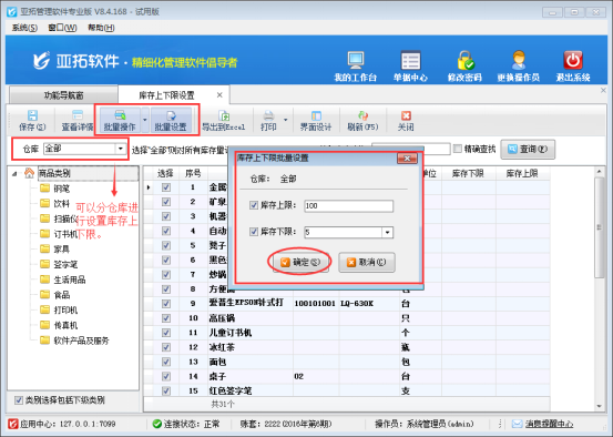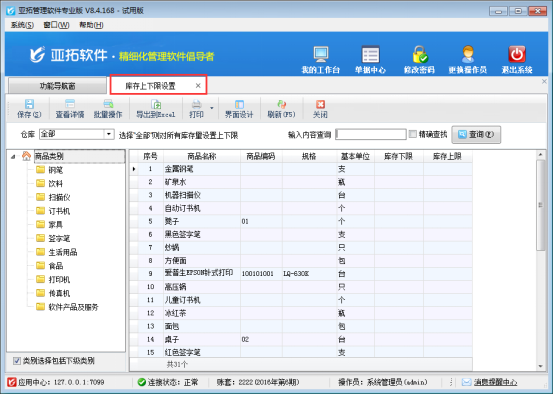 ????以“亞拓管理軟件專業(yè)版”為例,介紹如何設(shè)置庫(kù)存的上下限數(shù)量,在功能導(dǎo)航窗選擇“倉(cāng)庫(kù)管理”—》“庫(kù)存上下限”進(jìn)入庫(kù)存上下限設(shè)置界面,具體如圖1所示: