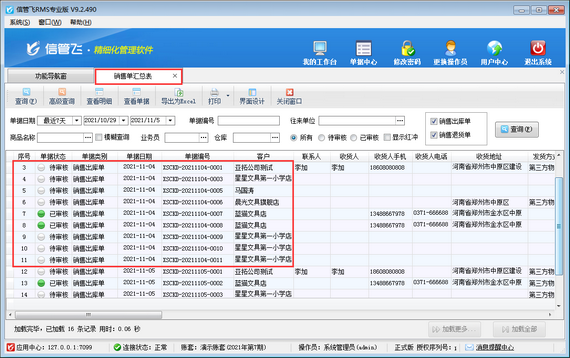 ????信管飛RMS軟件默認(rèn)開(kāi)單保存后即可生成單據(jù)編號(hào),即可打印。有些客戶進(jìn)行對(duì)賬時(shí)發(fā)現(xiàn)單據(jù)已打印,但在軟件的單據(jù)匯總表中查不到此單,此種情況可能是單據(jù)被誤刪了。如下圖為例,銷售單匯總表中,2021年11月4日缺少單號(hào)“0002”、“0004”,那么該如何補(bǔ)錄這些單據(jù)?下面我們以信管飛RMS軟件專業(yè)版,補(bǔ)錄“0002”單據(jù)為例,演示一下誤刪單據(jù)后如何補(bǔ)錄單據(jù)?