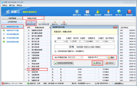 ????“單據(jù)編號(hào)規(guī)則設(shè)置”界面,找到“銷售出庫(kù)單”項(xiàng),點(diǎn)擊“編號(hào)規(guī)則設(shè)置”進(jìn)行設(shè)置。其中“流水號(hào)更新日期”修改為2021年11月4日,“當(dāng)前流水號(hào)”修改為1(要補(bǔ)錄0002單號(hào),所以當(dāng)前已存在的流水號(hào)是1),點(diǎn)擊“更新”,最后保存一下。如下圖所示: