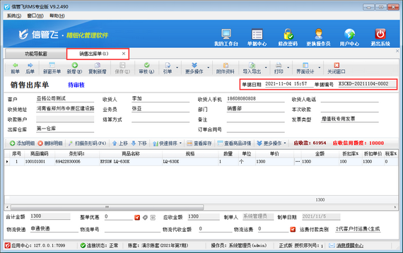 ????單據(jù)編號(hào)規(guī)則設(shè)置完成后,在銷售出庫(kù)單開(kāi)單界面新增單據(jù),錄入單據(jù)信息,修改單據(jù)日期為“2021年11月4日”,保存單據(jù),單據(jù)編號(hào)生成為“XSCKD-20211104-0002”,如下圖所示: