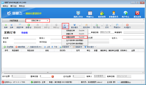 ????信管飛RMS軟件、信管飛倉(cāng)庫(kù)管理軟件支持開(kāi)采購(gòu)入庫(kù)單來(lái)管理采購(gòu)進(jìn)貨,也支持先開(kāi)采購(gòu)訂單然后根據(jù)采購(gòu)訂單進(jìn)行采購(gòu)商品入庫(kù)。有時(shí)需要根據(jù)單據(jù)中商品的實(shí)際銷售情況進(jìn)行采購(gòu)商品,那么該如何操作呢?軟件可通過(guò)引單銷售出庫(kù)單開(kāi)采購(gòu)訂單 ,下面以信管飛RMS專業(yè)版為例,演示下如何根據(jù)商品銷售情況開(kāi)采購(gòu)單?
