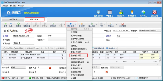 ????軟件支持按商品明細(xì)和單據(jù)開(kāi)票,已開(kāi)過(guò)發(fā)票的單據(jù)和明細(xì)可在匯總表中進(jìn)行查看開(kāi)票狀態(tài),本文介紹下按明細(xì)開(kāi)的發(fā)票在哪里查看是否已開(kāi)票?發(fā)票管理屬于擴(kuò)展模塊,信管飛RMS標(biāo)準(zhǔn)版和專業(yè)版支持?jǐn)U展,在功能導(dǎo)航窗選擇“采購(gòu)管理”—》“采購(gòu)入庫(kù)單”,保存審核單據(jù)后,點(diǎn)擊工具欄“更多操作”下的登記進(jìn)項(xiàng)發(fā)票,如下圖所示: