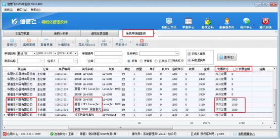 ????按明細(xì)開(kāi)票完成后,查詢開(kāi)票狀態(tài)需要到對(duì)應(yīng)的采購(gòu)單明細(xì)查詢中進(jìn)行查詢(按單據(jù)開(kāi)票需要在采購(gòu)單匯總表查詢)。在功能導(dǎo)航窗點(diǎn)擊“采購(gòu)管理”,在采購(gòu)管理右側(cè)“相關(guān)查詢統(tǒng)計(jì)”下選擇“采購(gòu)單明細(xì)查詢”,打開(kāi)采購(gòu)單明細(xì)查詢表,商品明細(xì)對(duì)應(yīng)的開(kāi)票狀態(tài)會(huì)顯示“已開(kāi)發(fā)票”和開(kāi)票金額。如下圖:
