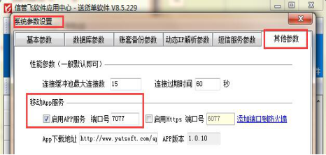 ????首先啟用電腦應(yīng)用中心中的移動(dòng)APP服務(wù),在應(yīng)用中心程序中選擇:系統(tǒng)參數(shù)—》其他參數(shù),勾選“啟用APP服務(wù)”,如下圖所示: