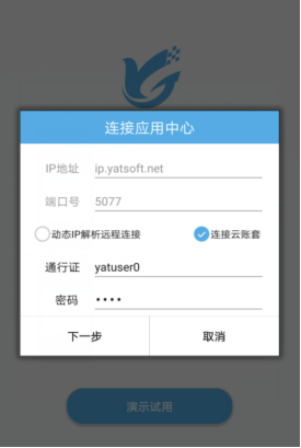 ????云賬套服務(wù)數(shù)據(jù)存在我們?cè)品?wù)器上,通過(guò)購(gòu)買分配的通行證賬號(hào)和密碼來(lái)連接獲取云端的數(shù)據(jù),直接手機(jī)APP點(diǎn)擊選擇賬套,勾選上“連接云賬套”,輸入通行證賬號(hào)和密碼,點(diǎn)擊下一步選擇賬套進(jìn)行登錄,如下圖所示: