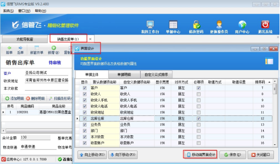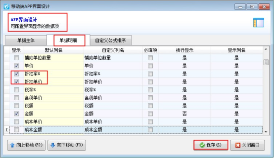 ????需要手機(jī)APP明細(xì)項(xiàng)顯示出“折扣率和折扣單價(jià)”該如何設(shè)置?手機(jī)APP的界面調(diào)整需要在電腦端界面設(shè)計(jì)“移動(dòng)端界面設(shè)計(jì)”中進(jìn)行調(diào)整,如下圖,打開電腦端軟件,銷售出庫(kù)單的界面設(shè)計(jì),選擇“移動(dòng)端界面設(shè)計(jì)”,勾選顯示出“折扣率和折扣單價(jià)”。
