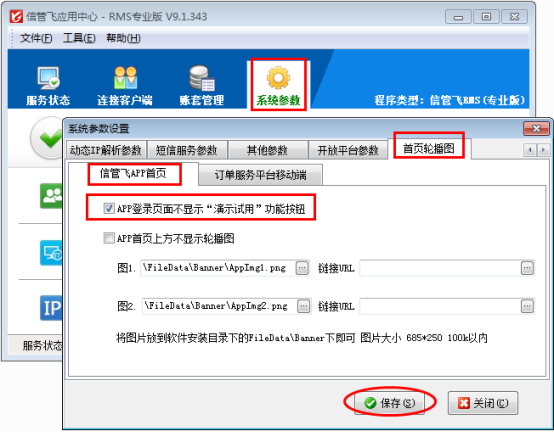 ????打開應(yīng)用中心窗口,點(diǎn)“系統(tǒng)參數(shù)”—》“首頁(yè)輪播圖”—》“信管飛APP首頁(yè)”,勾選“APP登錄頁(yè)面不顯示“演示試用”功能按鈕”,然后保存設(shè)置。如下圖所示: