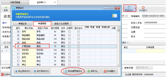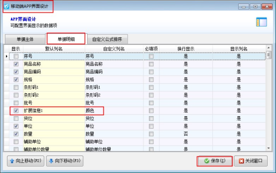 ????微信端界面設(shè)計(jì)需要在電腦端的開單界面界面設(shè)計(jì)中“移動(dòng)端界面設(shè)計(jì)”中配置。打開電腦端軟件界面設(shè)計(jì),選擇移動(dòng)端界面設(shè)計(jì),進(jìn)入APP設(shè)計(jì)界面,勾選單據(jù)明細(xì)“擴(kuò)展信息1”可向上移動(dòng)到規(guī)格數(shù)據(jù)項(xiàng)后邊,然后保存配置,如下圖所示: