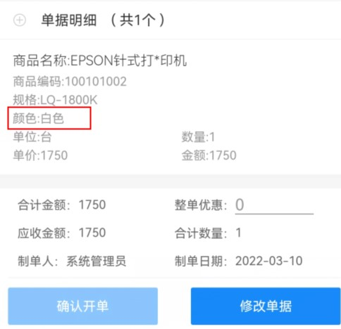 ????界面設(shè)計(jì)配置完成后,打開微信端軟件開單界面。會(huì)顯示“顏色”列,如下圖所示: