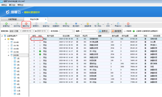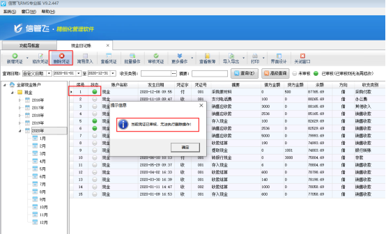 ????信管飛RMS標準版和專業版都包括登記出納日記賬憑證功能,在新增保存日記賬憑證后都可以直接審核憑證,憑證審核后,不允許直接刪除??蛻羧绻枰獎h除已審核的憑證,需要先反審憑證,再進行刪除。下面我們介紹一下在信管飛RMS專業版中如何刪除已審核的日記賬憑證?